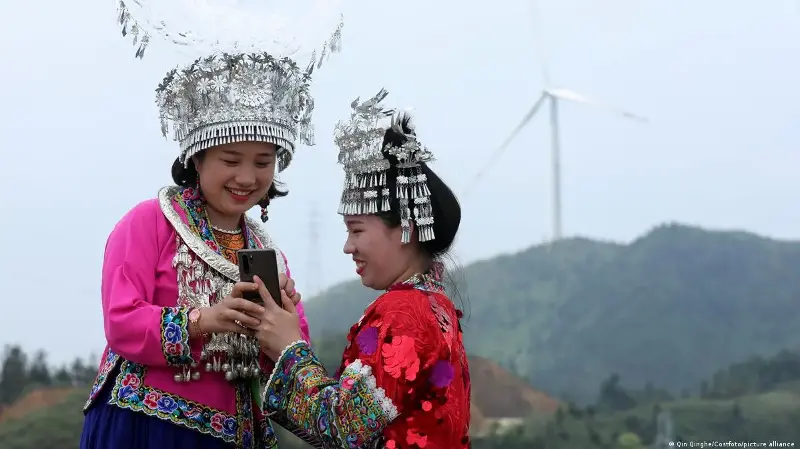 Joy over progress - Two women with headdress observe a selfie in front of a modern wind turbine in Rong'an County, China. China has made an unprecedented push for wind power in recent years. In 2020, turbines with a capacity of 53 gigawatts were newly installed, which is equivalent to the output of 53 new nuclear power plants in one year.