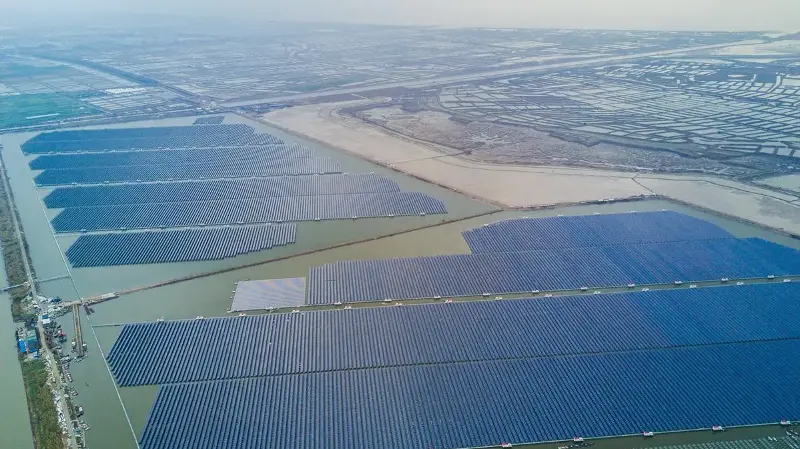Fish farm with solar harvest - This novel arrangement is in eastern China, 150 kilometers south of Shanghai. On this lake, solar panels float on pontoons, and beneath that is a fish farm. The panels were positioned to make sure the fish get enough light. The 300 hectares of panels produce electricity for 100,000 households.