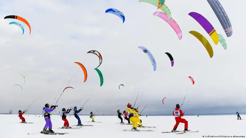 Skiing with a sail - Here in Novosibirsk, Russia, conditions are perfect for snowkiting — also known as kite skiing. The cold winters offer huge frozen areas and the wind blows strong. With the stunt kite once can reach very fast speeds of above 110 kilometers per hour.