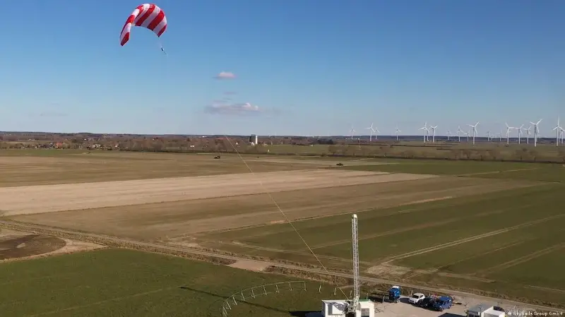Stunt kite makes electricity - Stunt kites can pull athletes and ships. This one in northern Germany generates electricity. During its ascent, the rope pulls on a winch with a generator. Once at the top, the kite is turned out of the wind and brought back with less energy, starting a new power generation cycle. The technology is being tested in cooperation with Europe's largest coal company, RWE.