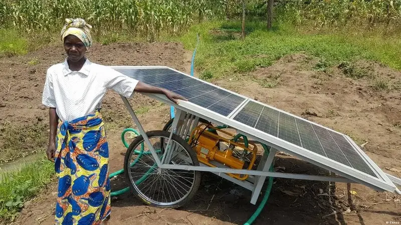 Water through solar - This farmer in Rwanda earns her money with a mobile solar water pump. She pulls her panel to other farmers' fields and irrigates them from nearby water sources for a small fee. Across Africa, there is substantial potential for solar modules in agriculture.