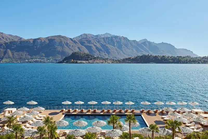 Rooms follow suit, with Calacatta Gold bathrooms. Below, a longevity spa turns to cold exposure, infrared, and oxygen. At the waterline, a floating pool rests directly on the lake. Villa Carlotta, with its Technicolor azaleas and sensuous marble figures, unfolds within walking distance.