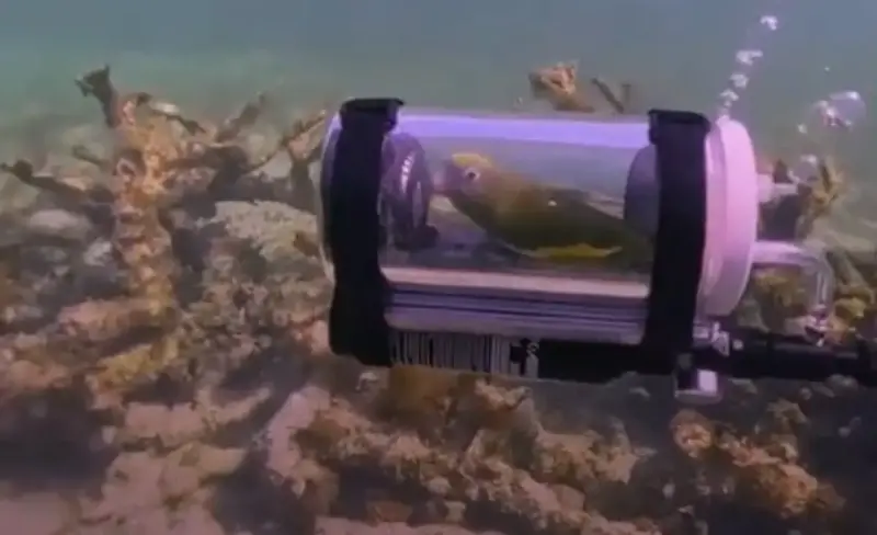 The quirky craft – dubbed the Bebosphere – was put together using a plastic food container and a paintball air tank. It carried the bird around 3ft below sea level for roughly 15 minutes while Mr Lawyer snorkelled alongside in calm waters.