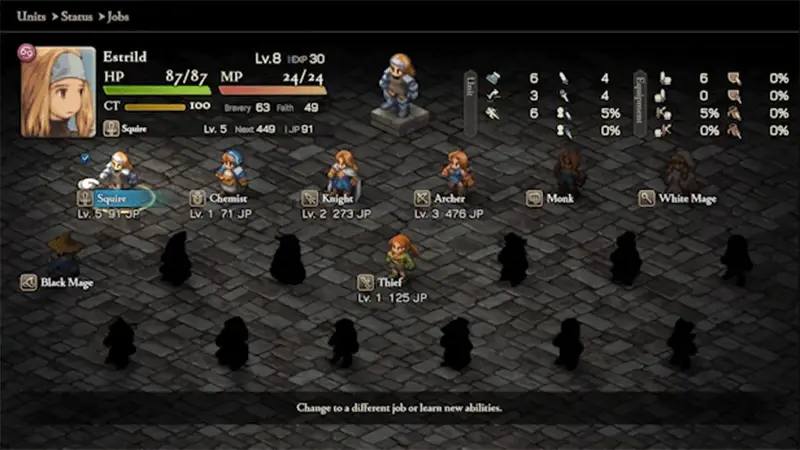 Each generic character can play as one of 20 jobs: Squire (the starter class for many of the physical classes), Chemist (the starter class for many of the magical classes), Knight, Archer, White Mage, Black Mage, Monk, Thief, Mystic, Time Mage, Geomancer, Dragoon, Orator, Summoner, Samurai, Ninja, Arithmetician, Dancer, Bard, and Mime. Some story characters, instead of being a Squire or Chemist, come with their own unique class and abilities.