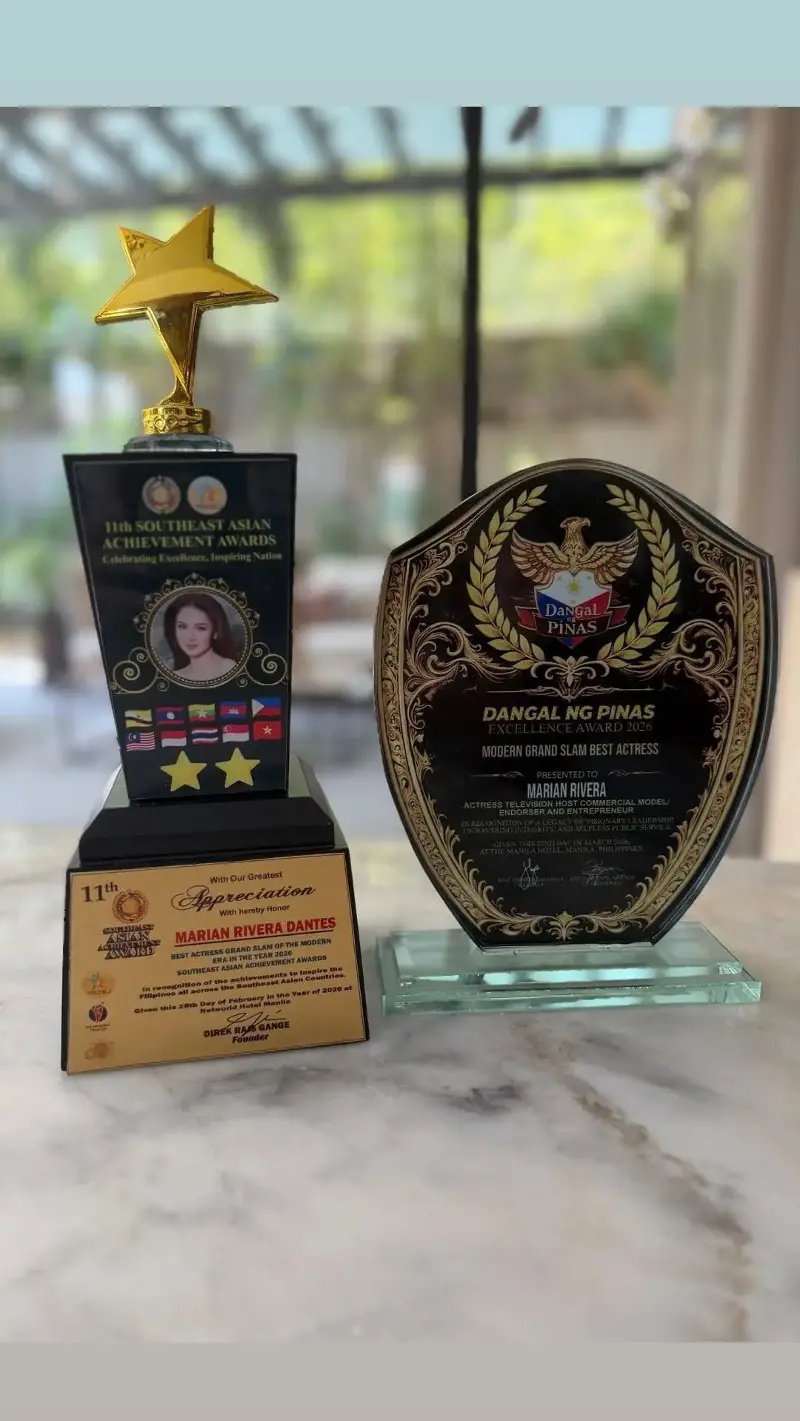 Dressed in a chic floral dress, Marian showcased her Modern Grand Slam Best Actress Award from Dangal ng Pinas, as well as her Best Actress Grand Slam of the Modern Era Award from the 11th Southeast Asian Achievement Award.