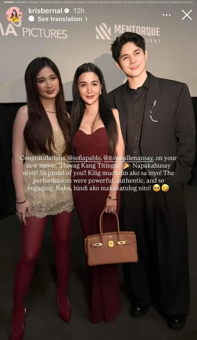Pagbati ni Kris para kina Sofia Pablo at Allen Ansay, “Congratulations @sofiapablo, @itsmeallenansay on your new movie, Huwah Kang Titingin. Napakahusay n'yo! So proud of you.”