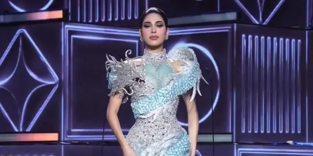 The Philippines’ bet walked down the runway in a light blue and silver gown with scales and waves inspired by a dragon and designed by Leo Almodal.