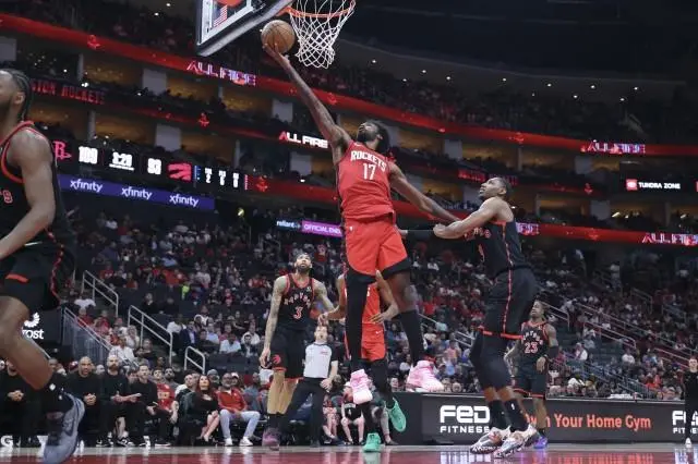RJ Barrett paced the Raptors with 25 points and six rebounds, while Scottie Barnes added 24 points. Toronto shaved a 10-point deficit to 73-72 late in the third before the Rockets pulled away.