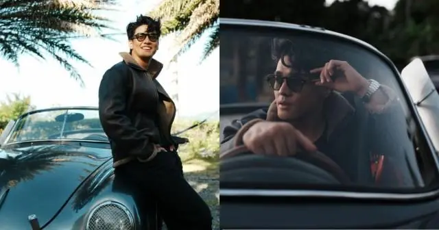 In the images, he is seen inside and beside a car, dressed in a dark outfit paired with a jacket and sunglasses, with wide outdoor views completing the road-trip mood.