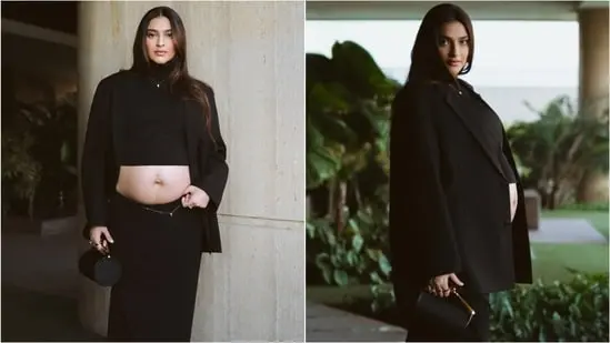 For the look, Sonam wore a black high-neck crop top paired with a long-sleeve blazer featuring a double collar and notch lapel. Instead of the usual pantsuit, she swapped it for a long, pencil-fit maxi skirt, giving the outfit a chic, maternity-friendly twist.
