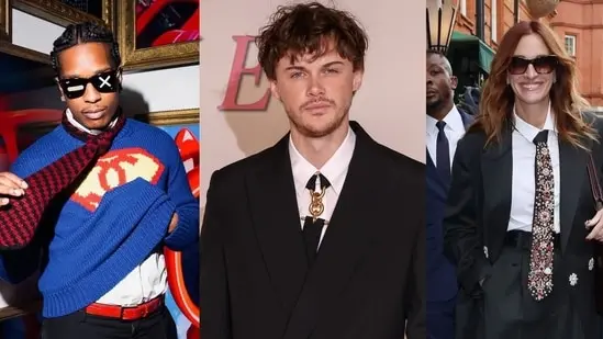 Other labels have created curved and sculpted versions that twist slightly or flare at the ends. Celebs have been quick to join the movement. Actor Julia Roberts wore a bejewelled tie with red gemstones, pearls and crystals at the London Film Festival, which instantly gave the trend a glamorous push. Meanwhile, Christopher Briney chose a tie held in place with a buckle.The buckle acted like a tiny accessory on its own and made the tie feel modern and low effort.