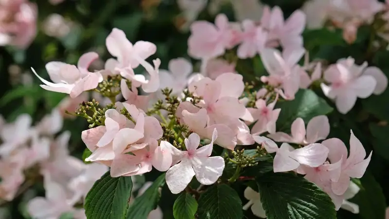 Dramatic horizontally tiered branches are crowded with distinctive white lacecap flowers in May and June, making the whole plant look like a wedding cake.