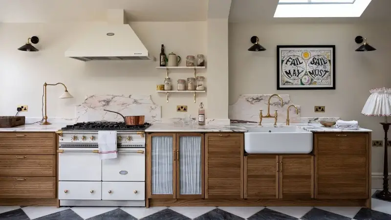 'I wouldn’t suggest plain silk or card lampshades in a kitchen, as if they catch an accidental splash, it will be very hard to disguise. Patterned gathered shades in cotton and linen are more forgiving, or a rattan shade is a great option – the choices are endless,' says Jo.