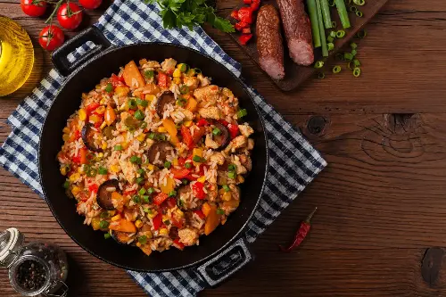 The Crescent City of New Orleans is renowned for its vibrant culture and Creole cuisine, with dishes like jambalaya—a riot of flavours combining European, African, and Native American influences. This rice-centric dish boasts a hearty mix of meat or seafood, the holy trinity of New Orleans cooking (onions, bell peppers, and celery), and a kick of Cajun seasoning, embodying the city's spirited character.