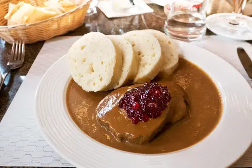 One dish you simply must not miss out on is svíčková na smetaně. This delightful plate consists of tender braised beef sirloin marinated in root vegetables, spices, and creamy sauce. Usually served with bread dumplings known as knedlíky, this meal offers a rich and comforting experience. The robust flavours come together beautifully, with a dollop of cranberry sauce and a slice of lemon adding a touch of tartness to balance the creamy texture.