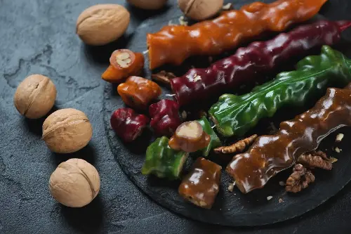 Georgian culinary adventures also lead you to Churchkhela, a snack that resembles a string of sausages but is in fact a confection. Walnuts, almonds, or hazelnuts are threaded on a string and repeatedly dipped into a thickened grape must, then dried to form a chewy, sweet treat. Often referred to as "Georgian Snickers," Churchkhela is a perfect blend of health and indulgence.