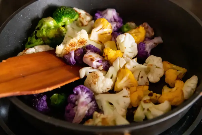 Spread chickpeas and vegetables on a rimmed baking sheet. Drizzle with olive oil, toss with spices, and season with salt. Roast at 425F for 20-25 minutes, shaking the pan halfway, until crispy and golden. Finish with a squeeze of fresh lemon for brightness.