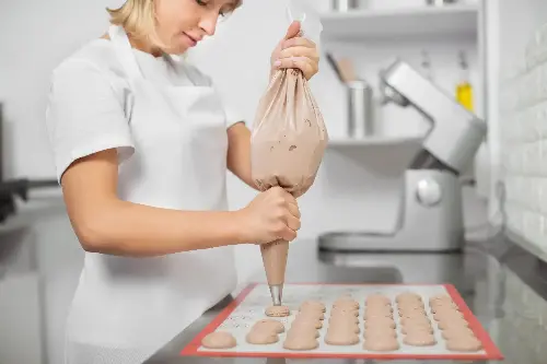 Pipe the mixture onto parchment paper or a silicon baking mat on your baking tray. Holding the piping bag vertically, pipe small circles, ensuring consistent sizes to promote even baking. Tap the tray vigorously on your countertop to release any trapped air bubbles, and use a toothpick to pop any that come to the surface.