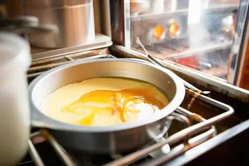 Creating the caramel requires patience, as sugar and water are gently coaxed over a medium flame into a golden liquid. One must heed the caramel's transformation as it journeys from a dissolved sugar solution to a rich, aromatic syrup. The colour is your cue; a deep amber is desirable, but take care not to let the sugar burn, which would impart a bitter taste to your glossy canvas.
