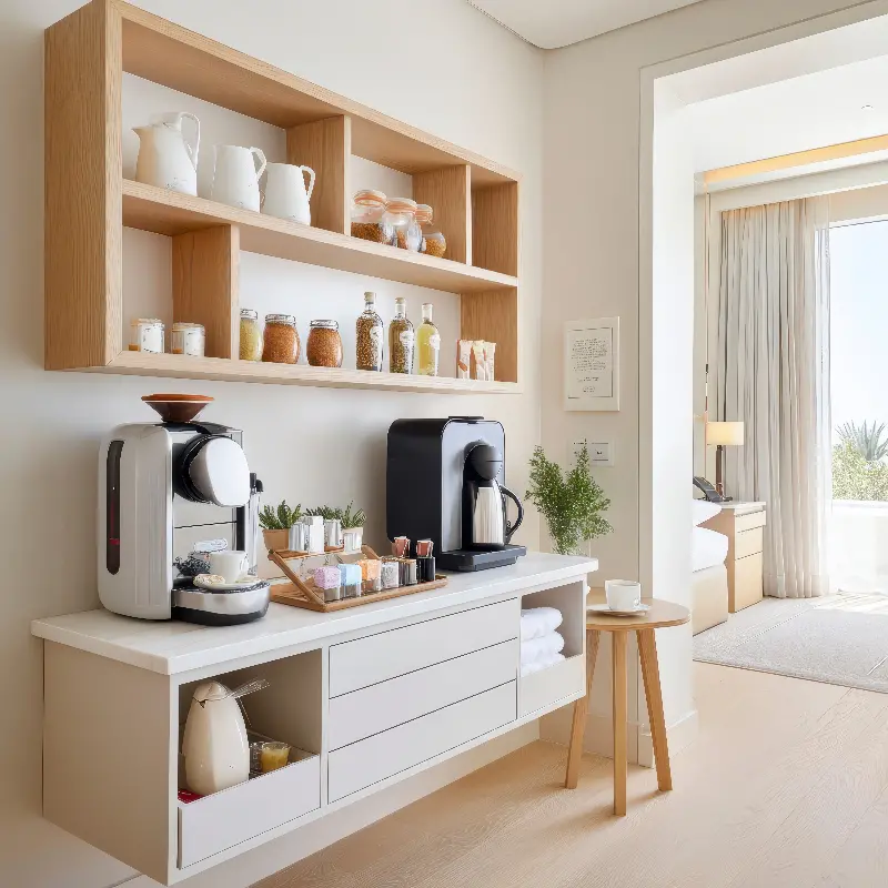 Even tight corners can host chic corner units that hold everything from wine bottles to Wi-Fi routers, keeping everyday clutter out of sight but close at hand.