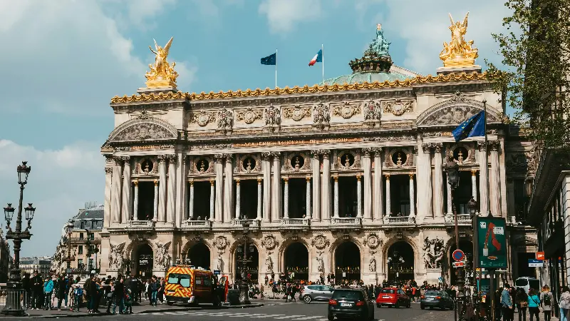 Visitors are often more enchanted by the building itself than the performances. The Grand Staircase, built from white marble with balustrades of red and green, serves as a stage where the audience becomes the show. Inside the auditorium, the ceiling features a massive, colorful fresco painted by Marc Chagall in 1964, providing a stunning contrast to the traditional gold-leaf ornamentation.