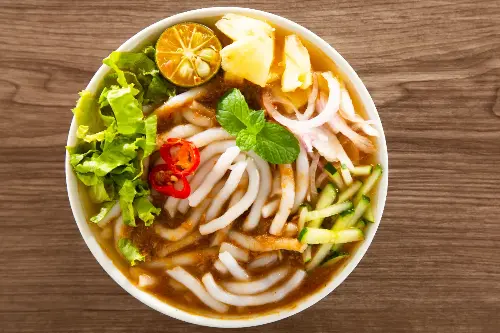 Asking for something spicy? Look no further than the Assam Laksa, a hearty, sour fish-based soup that hails from Penang. Tamarind juice, chilli, mint, lemongrass, and onions give this soup its distinct tangy and spicy flavour. Thick rice noodles and mackerel make the base of the dish, which is then garnished with cucumber, pineapple, onions, and a splash of prawn paste for an extra kick.