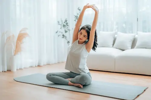 - Triceps and side stretch: Reach one arm overhead and bend the elbow, letting your hand fall between your shoulder blades. Use the other hand to gently pull on your elbow. Lean slightly to the opposite side for a deeper stretch down your ribcage and triceps. Hold for 20–30 seconds and repeat on the other side.
