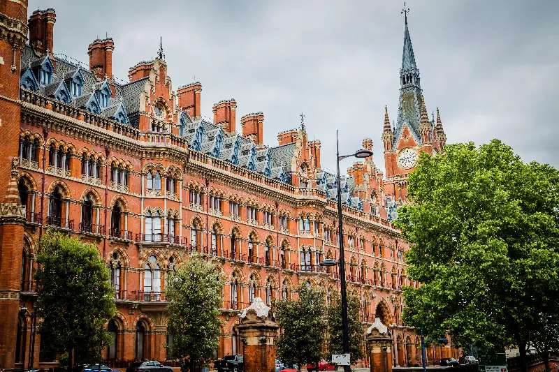 Arriving in central London is a breathtaking experience thanks to St. Pancras International. Completed in 1868, the station showcases Victorian Gothic Revival at its most dramatic, featuring pointed arches, dazzling tilework, and grand spires.