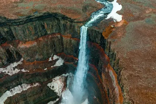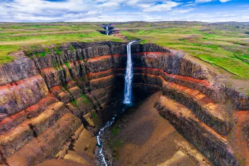 As you gaze upon Hengifoss, it's impossible to miss the hallmark feature of the waterfall - the vibrant layers of rock formations that date back millions of years. It's as if nature, acting as a meticulous artist over the eons, painted stripes of red clay and black basalt along the cliff face. These colourful sedimentary layers are interspersed with thin bands of white, a product of volcanic ash that settled there long before human memory. These rock sequences tell a story of ancient volcanic eruptions and the gradual shaping of the Icelandic landscape.