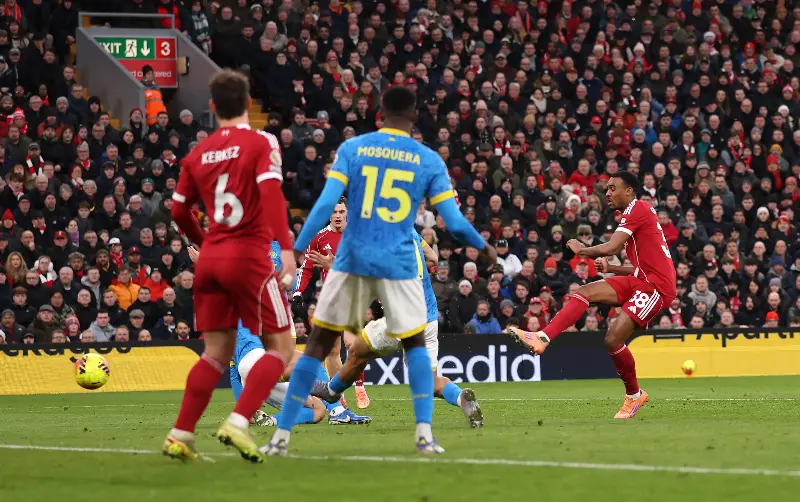 As the first half drew toward its conclusion, Liverpool’s persistent pressure finally broke the deadlock. In the 41st minute, Ryan Gravenberch showcased the technical growth he has achieved this season. Controlling a difficult ball inside a congested penalty area with deft precision, the Dutch midfielder turned and fired a clinical shot into the back of the net, sending the Anfield faithful into raptures.