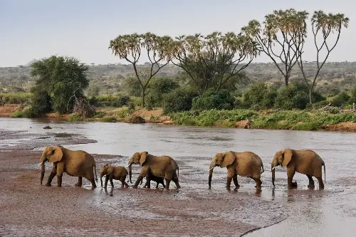 To the north, the rugged wilderness of Samburu, Buffalo Springs, and Shaba National Reserves lure in those who seek the road less traveled. These arid landscapes, dissected by the life-giving Ewaso Ng'iro River, are home to unique species that have adapted to the harsh climate. It's here that one encounters the regal Beisa oryx, the long-necked gerenuk antelope standing tall on its hind legs to reach for higher foliage, and the striking Grevy's zebra with its distinctive narrow stripes.