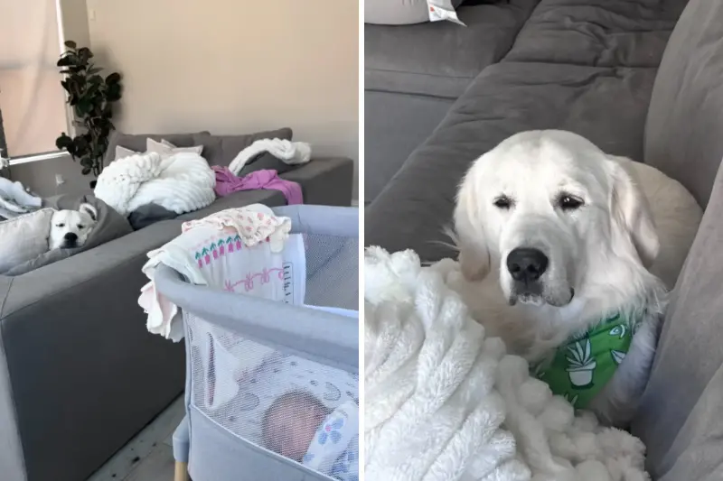 Harley, 23, showed just how wiped out her year-old golden retriever was from the newborn routine in a post on TikTok. One picture even showed Teddy asleep mid-staircase with his head drooping off a step, a toy still in his mouth.
