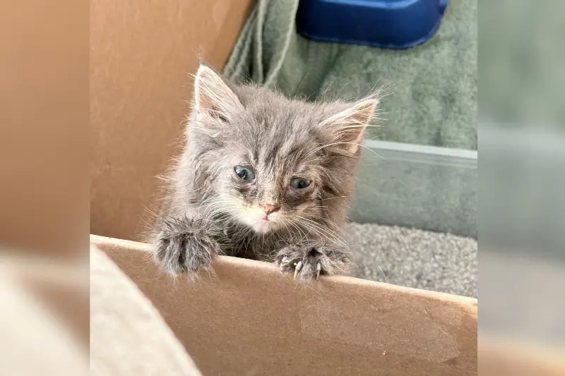 “I kept driving for about 20 seconds before realizing she wasn’t going to survive out there on her own. I turned around, pulled over, and the kitten darted under my car. A man in a pickup truck stopped to block traffic so neither of us would get hit. Within moments, the kitten was in my hands. She was tiny, weak, and fit entirely in one palm,” he said.