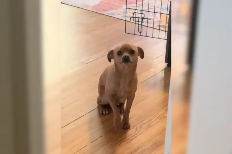 Farmer’s rescue dog named Pickle, a Chihuahua and Shih Tzu mix, was sitting on the other side of the door, staring intently until it finally opened.