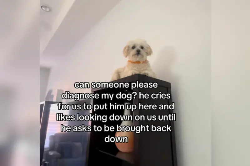 “Can someone please diagnose my dog? He cries for us to put him up here and likes looking down on us until he asks to be brought back down,” the owner writes in the caption. “Cat behavior.”