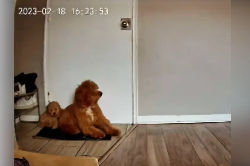 It shows Charly and Coco curled up on the mat by the door, first appearing to be fast asleep. But all of a sudden, Charly perks up, with tiny Coco soon following suit. He stares at the door, obviously hearing something, and then barks.