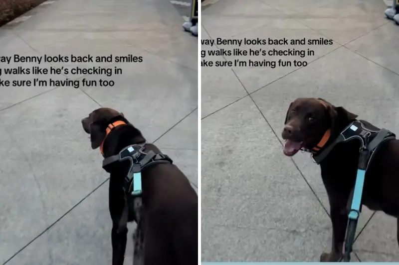In a March 1 TikTok video posted under @nashbennychocoduo, a chocolate-colored Labrador retriever named Benny can be seen trotting confidently along a scenic waterfront path at sunset, a few steps ahead of his owner. Benny repeatedly glances over his shoulder every few steps, each time offering a quick look and a relaxed, open-mouthed expression before moving forward again.