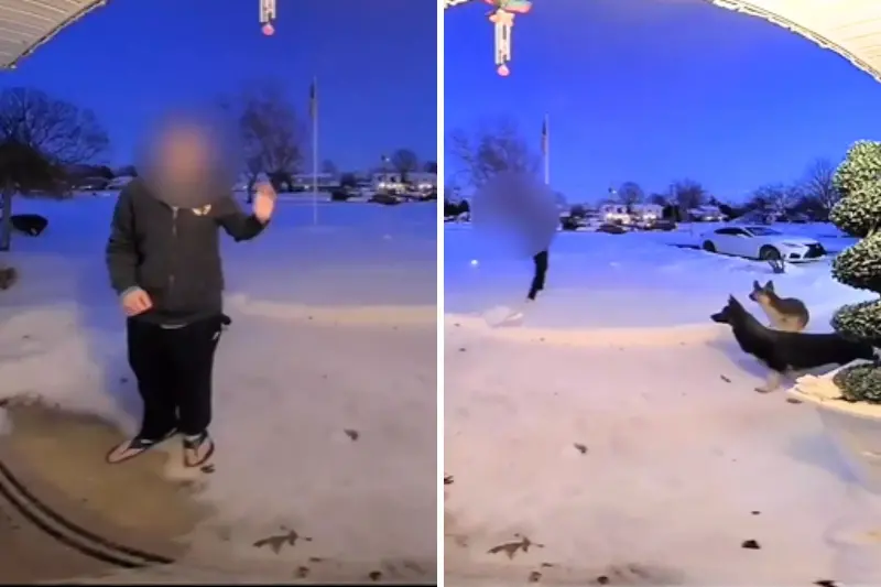 In a recent Instagram video posted by @shepherd.sisterss, a doorbell camera captured the moment a stranger approached the home to let the residents know their two dogs were out. Just after he rang the bell, two German shepherds approached barking at him, prompting him to curse under his breath and carefully retreat through the snow.
