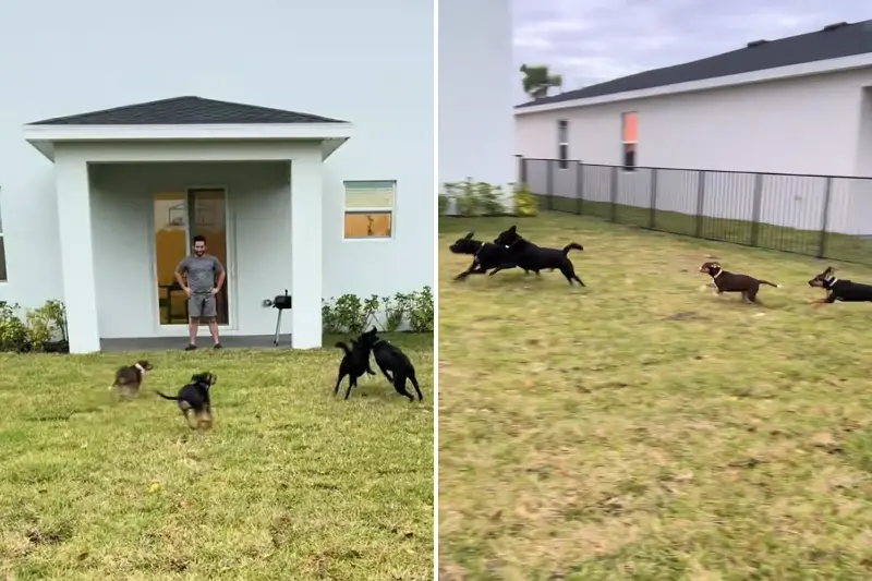During the footage, Durden can be seen calling the dogs out into the yard for the first time. Once they all realized they were free to roam around, there was no stopping the chaotic zoomies.