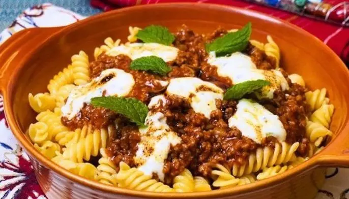 3. Assemble the dish. Arrange cooked pasta in a serving bowl. Pour tomato beef sauce over the pasta. Top with garlic yogurt sauce.
