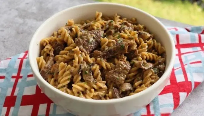Beef Stroganoff is slow-cooked strips of tender beef (oftentimes sirloin) with mushroom and onion, simmered in a rich and creamy sauce, and served with pasta or rice.