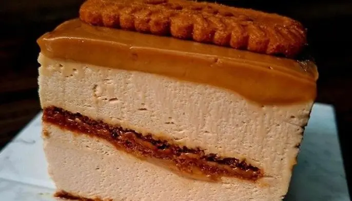 7. When ready to serve, remove Tiramisu from baking mold, peel off the baking paper, clean the sides of the Tiramisu, and slice with a hot but dry knife to make clean cuts. Top each piece with a Biscoff cookie and serve. Enjoy!
