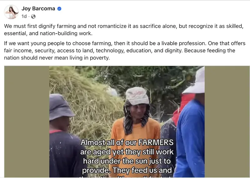 MANILA, Philippines — Miss Philippines Earth 2025 Joy Barcoma strongly believes in "dignifying farming" to encourage young people to take farming as a profession.