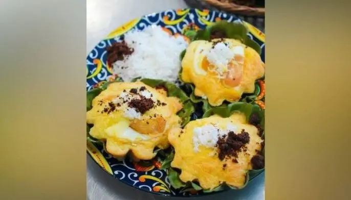 5. Line ensaymada molders with banana leaves, measure 1/2 cup batter and pour into each molder, and top with cheese and salted egg.