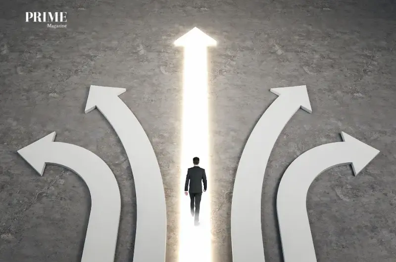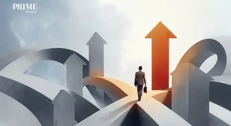 Business professional stepping onto glowing upward arrow among intertwined paths symbolizing decision making progress and opportunity