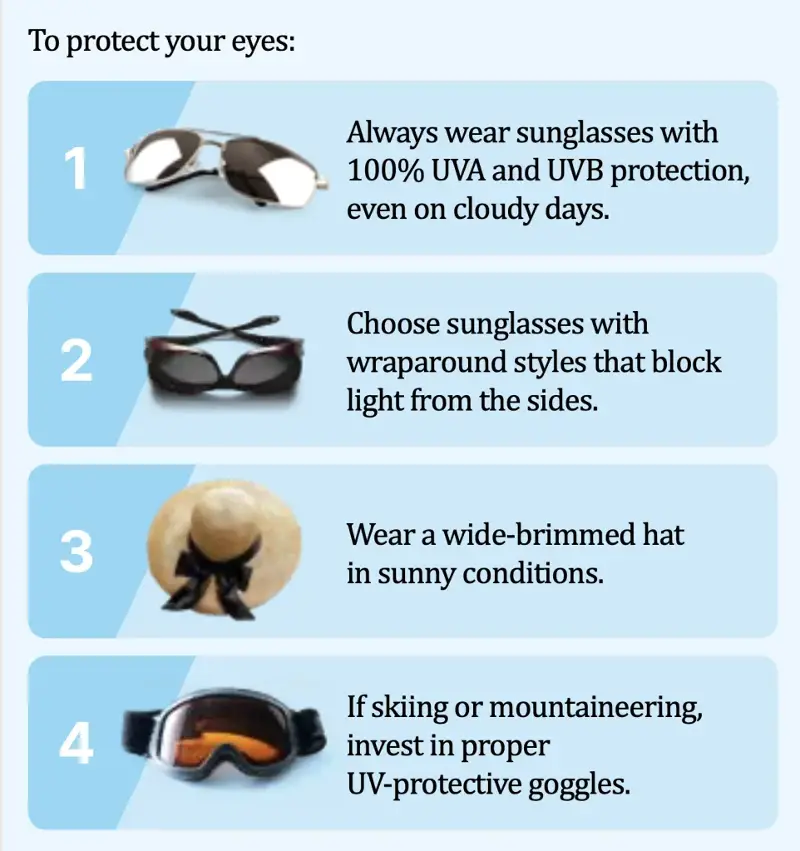- Always wear sunglasses with 100% UVA and UVB protection, even on cloudy days.