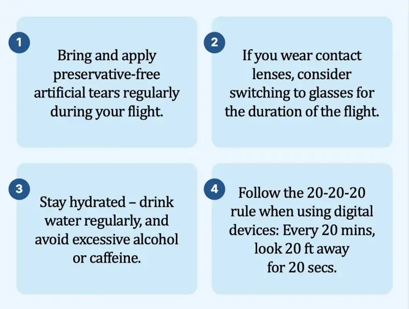 1. Bring and apply preservative-free artificial tears regularly during your flight.