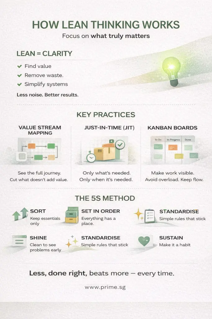 Each change compounds over time. In a cluttered world, Lean Thinking is the gentle art of focus — a reminder that less, done right, is infinitely more. PRIME