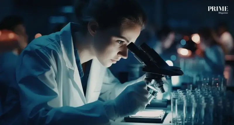 Scientists studying cells under microscope