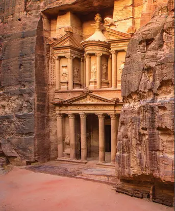 The approach through the narrow Siq builds anticipation before revealing the Treasury. Beyond it lie royal tombs, theatres, and water systems that once supported tens of thousands of inhabitants.